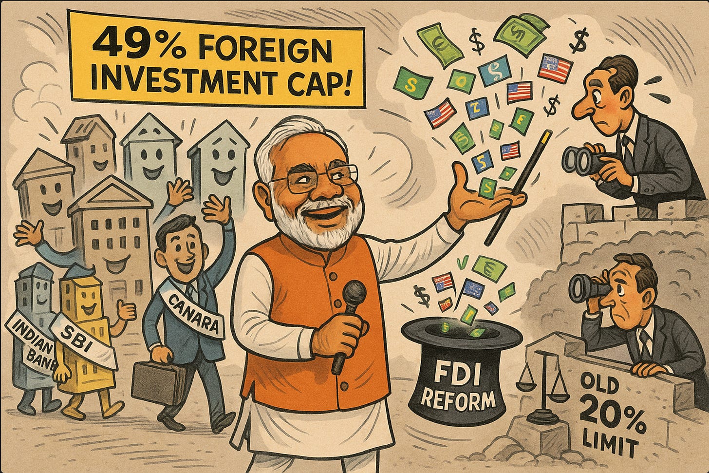 Sensei’s Insight: A 49% FDI cap would open the floodgates for foreign capital—but execution and political timing will determine whether India’s public banks can truly compete on global terms.