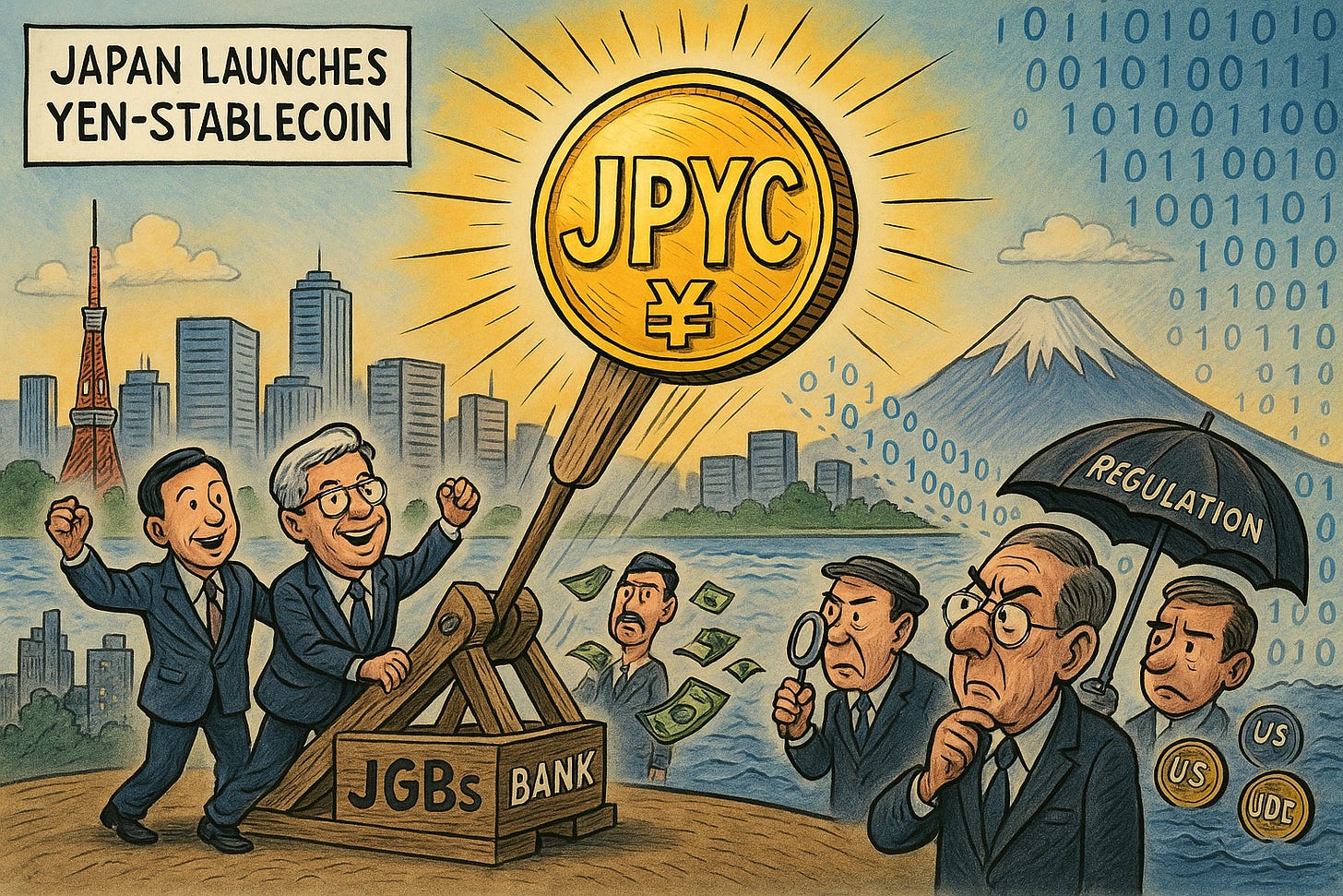Japan’s fintech startup JPYC Inc. has issued the world’s first stablecoin anchored to the Japanese yen (JPY), a milestone in Asia’s digital-asset evolution. The token—also named “JPYC”—is fully convertible to the yen and backed by domestic bank deposits and Japanese Government Bonds (JGBs), under Japan’s revised Payment Services Act. The issuer aims to mint up to ¥10 trillion (≈ $66 billion) of JPYC over three years and plans to charge zero transaction fees, generating revenue instead from interest on its JGB reserves. (Reuters, CoinDesk)