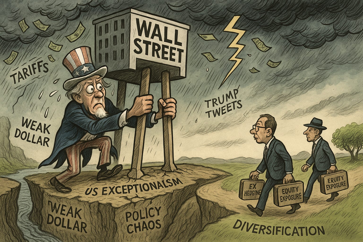 Wall Street's recent surge to fresh highs masks growing concern among institutional investors about the durability of America's financial leadership. A perfect storm of tariff unpredictability, a rapidly weakening dollar, and increasingly stretched tech valuations is triggering a reconsideration of longstanding US-heavy allocations (Reuters). Bank of America's March survey showed clients slashed long US equity positions by 40 percentage points—the largest drop on record (TradeAlgo). Meanwhile, foreign investors have been reducing FX hedges on dollar-denominated assets for three straight years (State Street), signaling a structural departure from the "US exceptionalism" narrative that defined global market behavior through 2024 (Goldman Sachs, Brookings).
