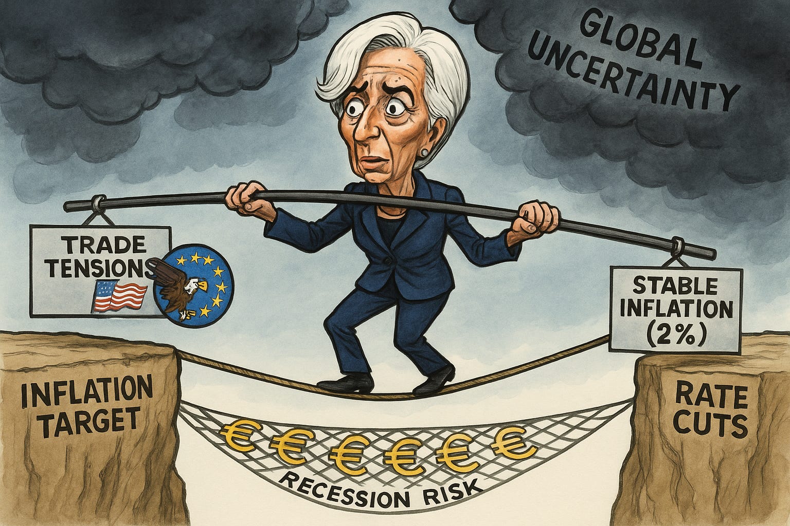 This inflation backdrop supports the ECB’s decision last week to keep interest rates on hold at 2%, after cutting rates by a cumulative 200 basis points over multiple meetings since June 2024 (Trading Economics, FT). Markets now assign just a 50% chance of another cut this year, as policymakers adopt a cautious, data-dependent stance amid trade tensions between the U.S. and EU (La Française, Reuters). With interest rates near neutral and inflation expectations anchoring, future moves will likely hinge on how global trade disputes resolve and their broader economic impacts (PIMCO, Reuters).