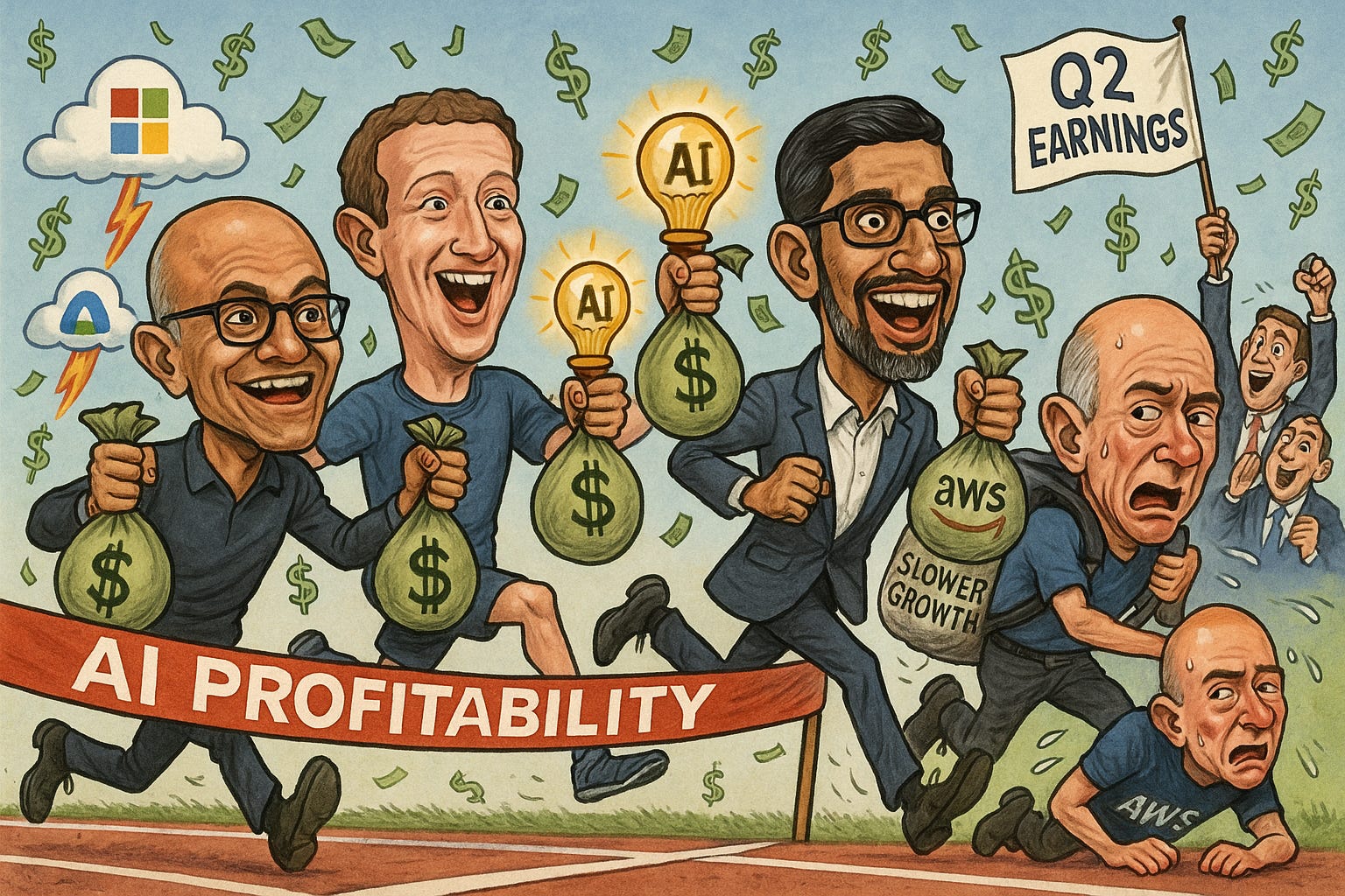 The current earnings season marks a turning point, shifting AI from a speculative narrative to a revenue-generating force. Microsoft and Meta’s clear monetization success—$13B in AI revenue and measurable ad lift, respectively—offers the validation investors have demanded amid projections of nearly $400 billion in 2025 AI infrastructure spend (WSJ, Investing). Meanwhile, Amazon tumbled 6.6% pre-market, despite an earnings beat, as its AWS growth (17.5%) trailed Microsoft Azure (39%) and Google Cloud (32%) (CNBC, AJ Bell, Amazon IR). The AI arms race is no longer about who spends the most—it’s about who delivers results.