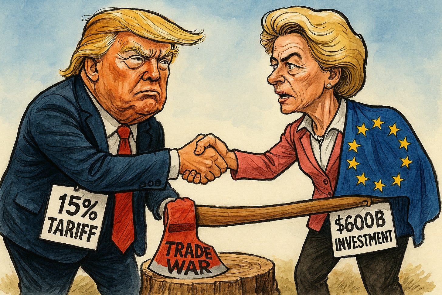 President Donald Trump and EU Commission President Ursula von der Leyen reached a last-minute trade agreement at Turnberry, Scotland, on Sunday, July 27, halving the planned U.S. tariff on European imports from 30% to a flat 15% starting August 1 ( Reuters ). In exchange, the EU pledged $600 billion in new investment in the U.S. and agreed to purchase $750 billion in American LNG and energy products over Trump’s term, along with major orders for U.S. defense equipment ( Bloomberg ). The deal averted a full-blown trade war that could have escalated sharply in August.