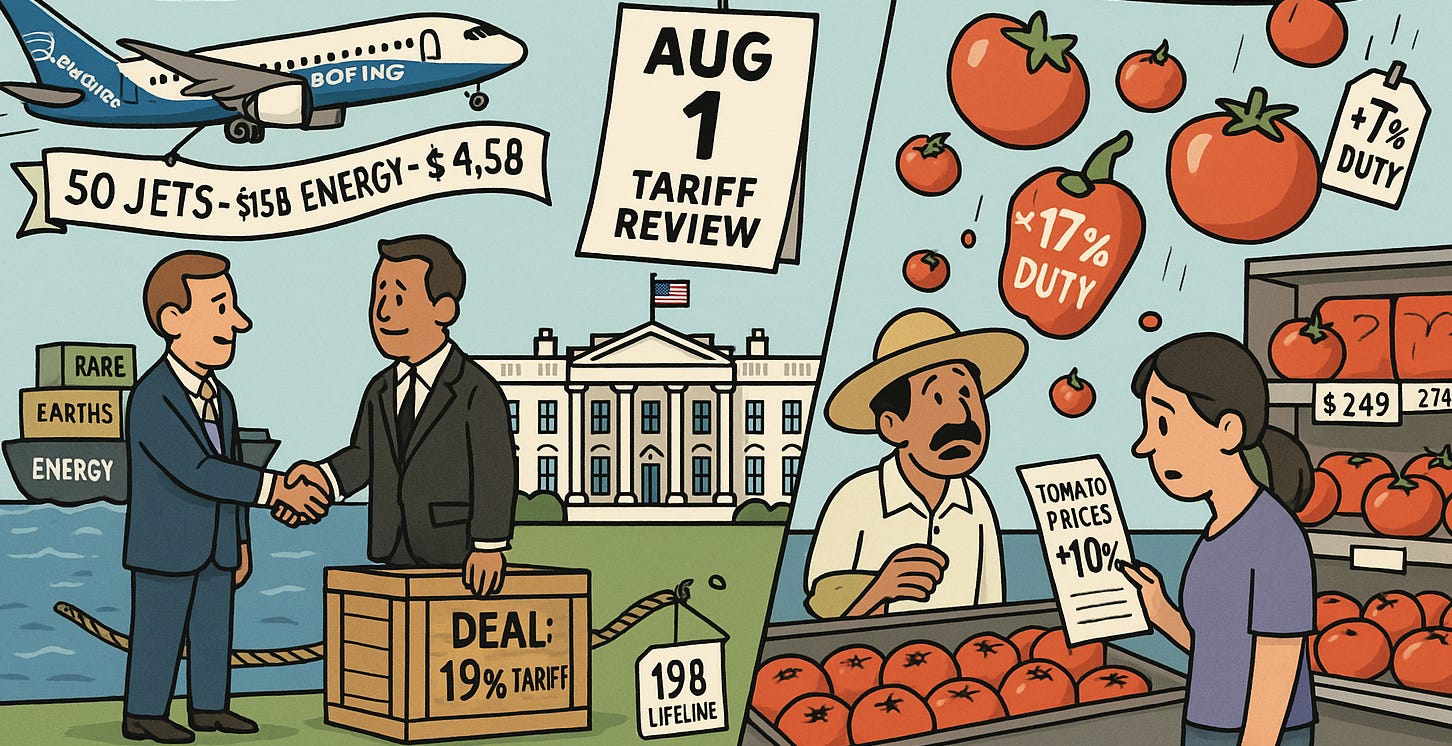 Sensei’s Insight: Dual-front tariff maneuvers signal rising volatility for agribusiness, aviation, and emerging-market trade partners—investors should brace for policy-driven swings through August.