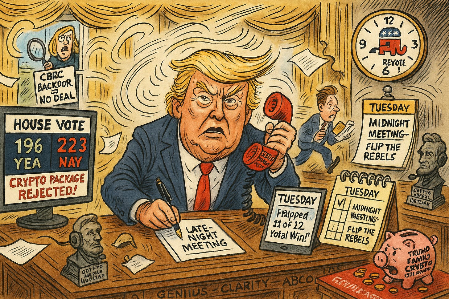 House Republicans defied President Trump on Tuesday, blocking a procedural vote on three major cryptocurrency bills central to the administration's "Crypto Week" agenda. The 196-223 defeat saw 13 conservative Republicans join Democrats in rejecting the legislative package, which included the GENIUS Act for stablecoin regulation, the CLARITY Act for crypto market structure, and the Anti-CBDC Surveillance State Act (ABC News, Cointelegraph). Dissenting lawmakers, led by Rep. Marjorie Taylor Greene, raised alarms about potential backdoors for central bank digital currencies (CBDCs) in the GENIUS Act—even though the bill contains explicit language prohibiting the issuance of a CBDC—demanding stricter prohibitions despite existing language in the Anti-CBDC Act (Forbes). They also criticized House Speaker Mike Johnson’s refusal to allow amendments or separate votes on the three measures (Cointelegraph).