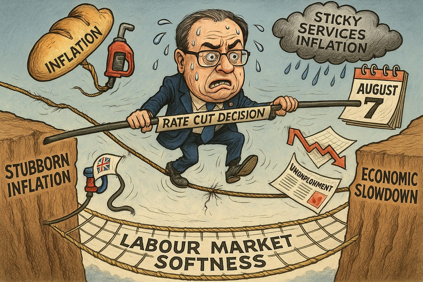 The Bank of England is navigating a high-stakes policy dilemma ahead of its August 7 meeting, with markets pricing in a 93.6% chance of a 25 basis point rate cut to 4% (Morningstar, Bloomberg). This comes as UK inflation unexpectedly rose to 3.6% in June, up from 3.4% in May, driven by transport and food costs (Trading Economics, CNBC). Food inflation hit 4.5%, its highest since February 2024. Core inflation climbed to 3.7%, while services inflation stayed sticky at 4.7%. The BoE had forecast a 3.7% peak for inflation between July and September before a return toward the 2% target (Bank of England).