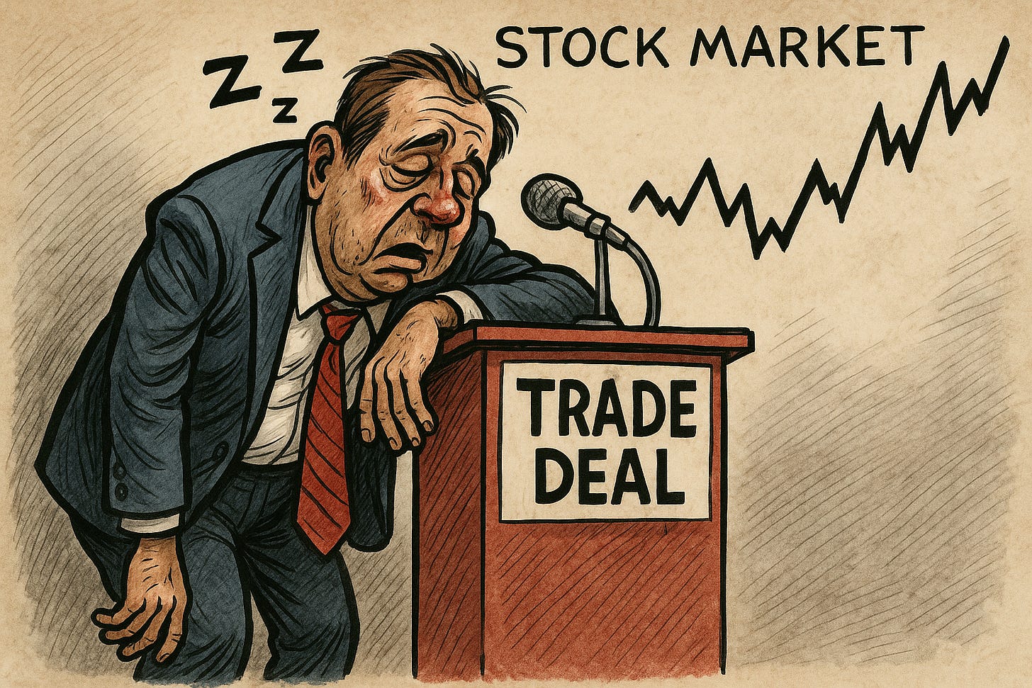 Wall Street’s enthusiasm for trade agreements appears to be fading, with the latest US-EU trade pact sparking only muted reactions. The deal—introducing 15% tariffs on most European goods instead of the previously threatened 30%—failed to ignite the sharp rallies once common after such announcements. European equities slipped slightly, and the euro dropped around 0.7% against the dollar (Reuters; Bloomberg). In the U.S., stocks closed essentially flat, a stark contrast to the surge seen after Trump’s recent US-Japan framework agreement. The S&P 500 edged up just 0.1%, weighed down by losses in energy shares and nearly flat chipmaker gains (Swissinfo).