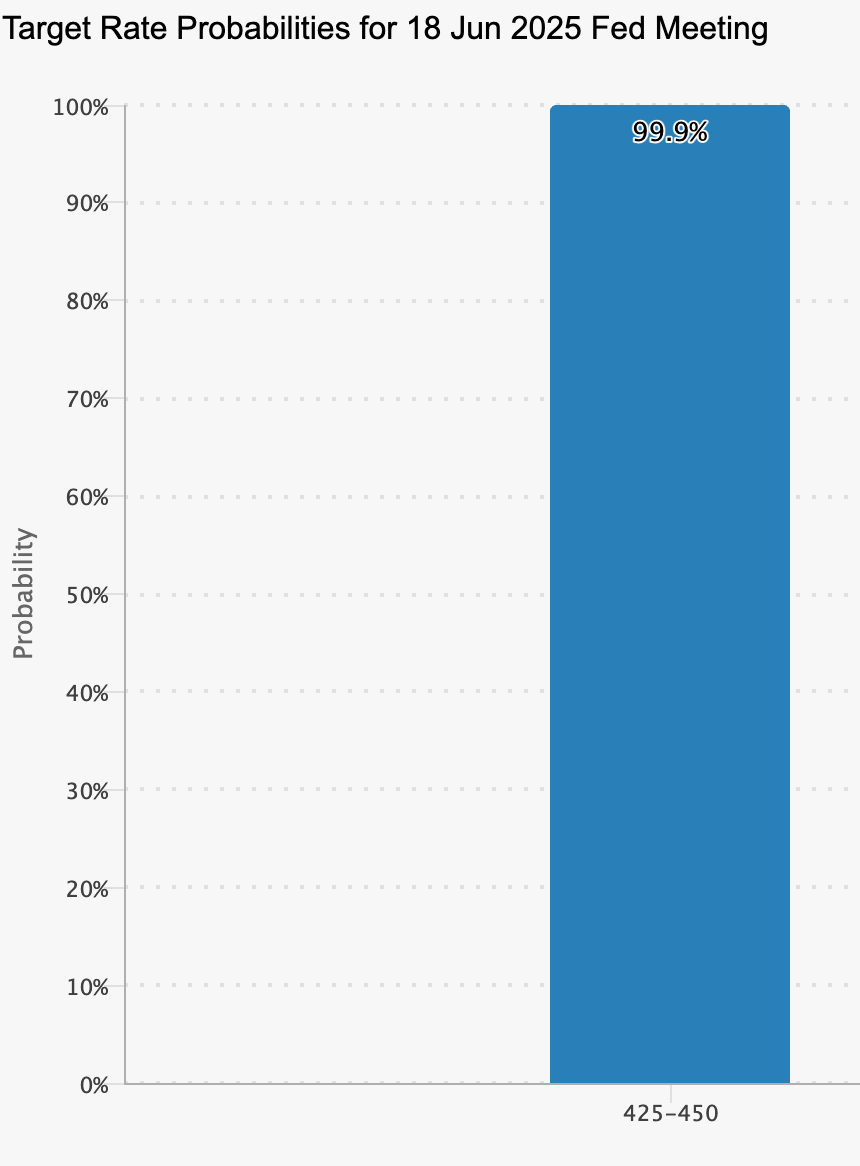 Markets are currently pricing in two rate cuts from the Federal Reserve by year-end, with futures implying the fed funds rate could fall to the 3.75%–4.00% range. There have been zero Federal Reserve rate cuts so far in 2025. However, all eyes are on this Wednesday’s US CPI inflation report, which will be pivotal for shaping expectations ahead of the Fed’s next policy meeting on June 18. Fed officials have signaled a cautious stance, and the consensus is for no rate change next week, but softer inflation data could tip the balance toward a cut as early as July or September. The most likely scenario: the Fed holds steady in June, waits for more evidence of cooling inflation, and potentially starts cutting in September.