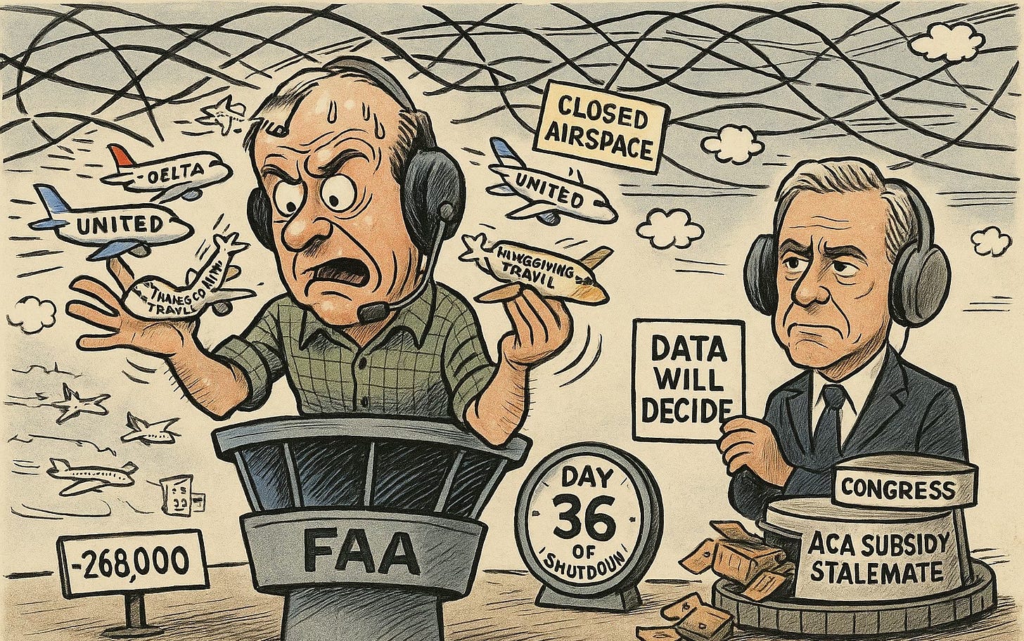 At the core is a worsening air traffic controller crisis, with up to 40% of controllers absent at major facilities and a record 98 “staffing trigger” incidents logged last weekend (CNN; BBC). Controllers, unpaid since October 1, are working 60+ hour weeks under intense fatigue. The shutdown stalemate, driven by disputes over Affordable Care Act subsidies, shows no progress toward resolution, leaving airlines bracing for Thanksgiving chaos. United Airlines is trimming regional routes to protect international operations, while Frontier warned passengers to buy flexible fares. Airline stocks dipped about 1% after hours, with broader markets holding steady, for now. But if controller absences deepen, Duffy warned, “selective airspace closures” could follow, threatening a full-scale disruption (CNBC).