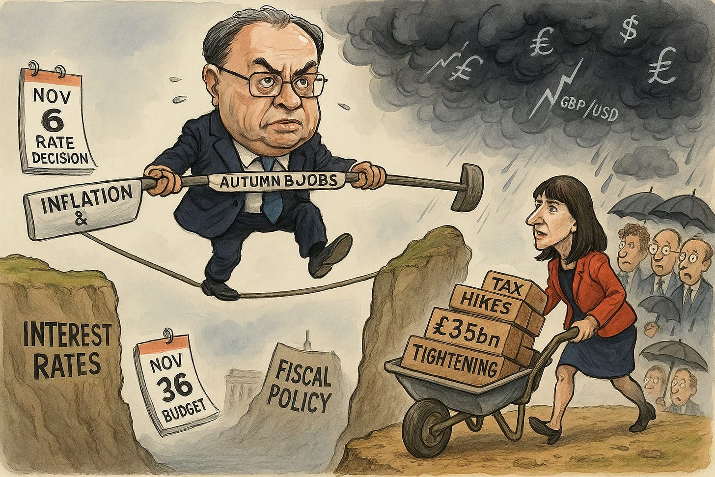 Policymakers are also constrained by fiscal timing. Chancellor Rachel Reeves’ Autumn Budget, due November 26, is expected to tighten fiscal policy by as much as £30–35 billion, largely through tax rises on capital, property, and savings rather than corporations. That leaves the MPC wary of acting before it sees how new taxes affect demand. Analysts expect a December or February cut if the economy continues to cool. For investors, the twin events could drive sharp market moves: GBP/USD has slipped to 1.30, and gilt yields are volatile as traders brace for both policy and fiscal surprises (CNBC; Charles Stanley).