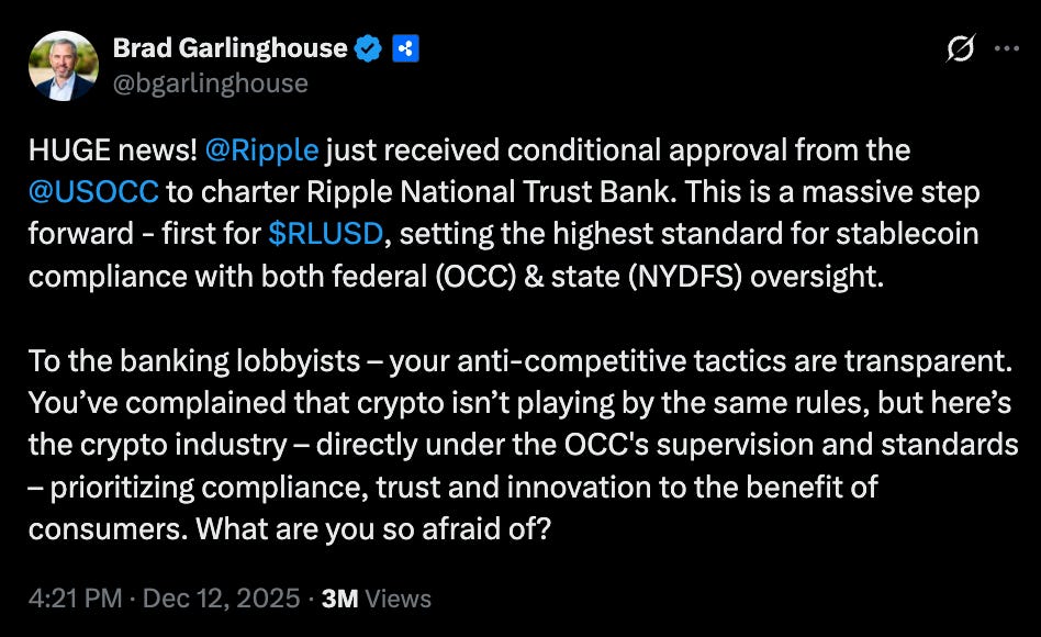 🏛️ Ripple Gets Federal Bank Charter: Ripple received conditional approval to operate a national trust bank under federal supervision.