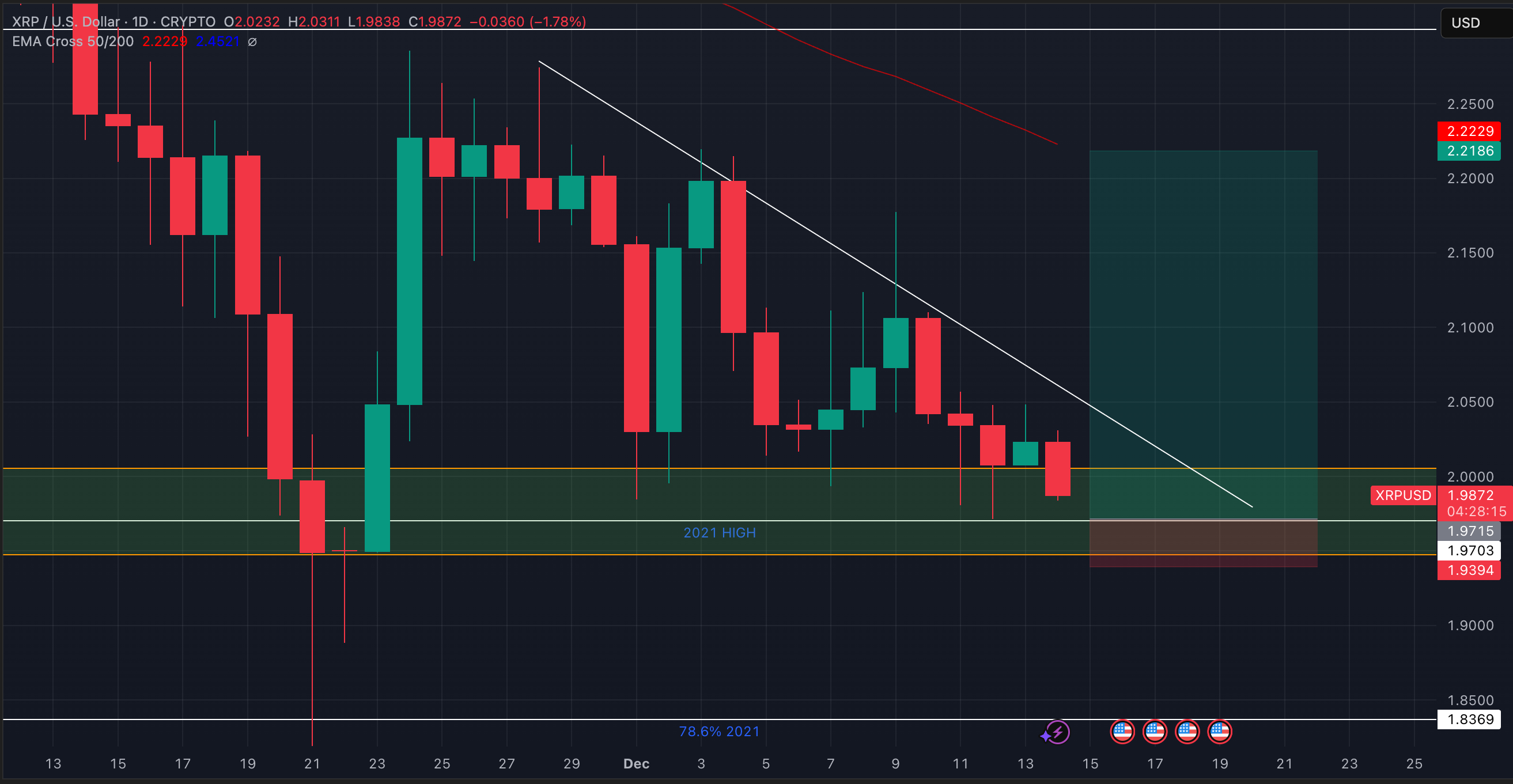 $XRP is currently contesting a critical support zone at $2.00. This level has historically been a high-volume trading area extending up toward $2.30. The immediate focus is on whether price can maintain footing at this $2.00 floor while attempting to breach the overhead downward-sloping resistance line.
