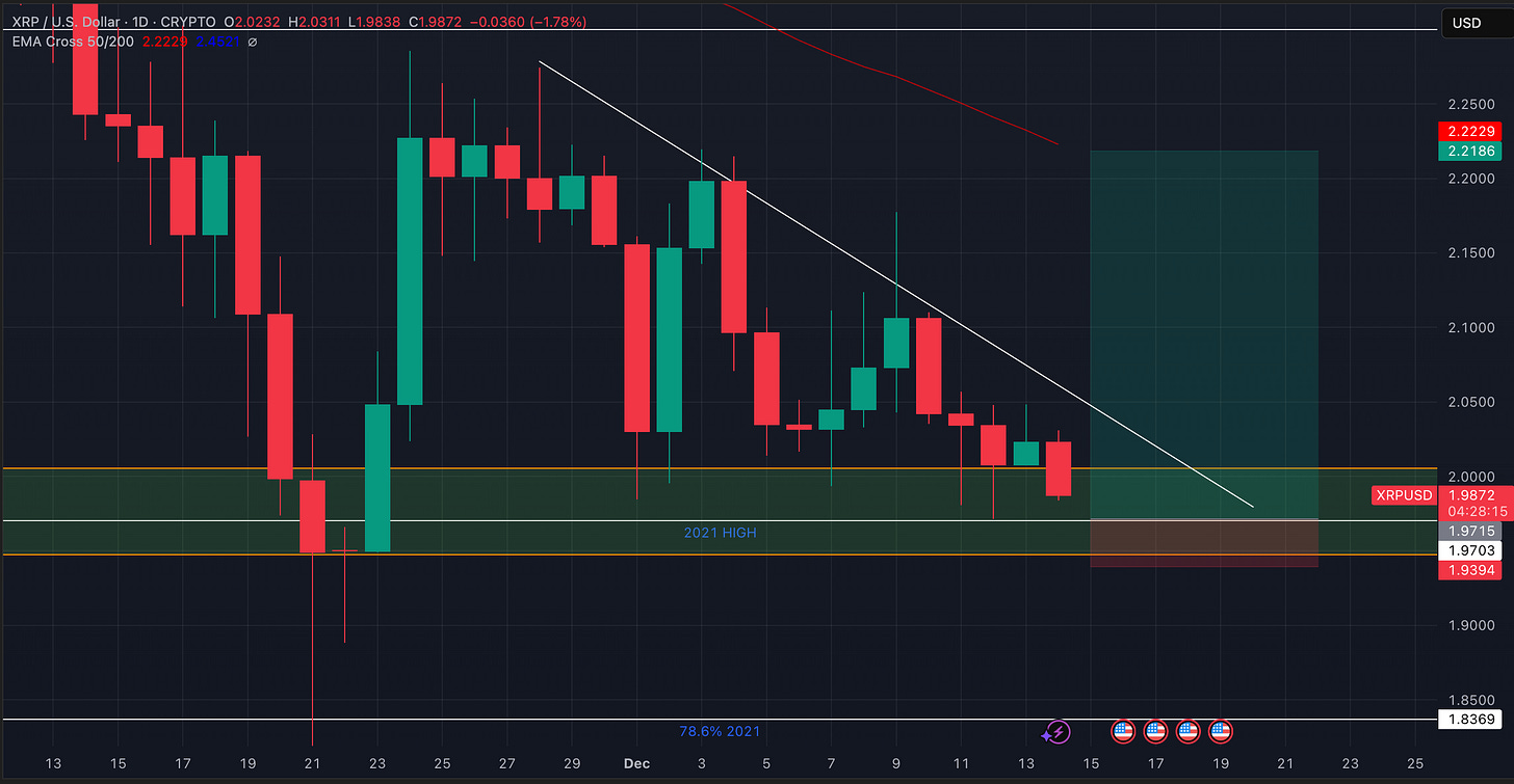 Successfully holding $2.00 and breaking that trendline structure could present an opportunity for upside. In this scenario, the initial target sits around $2.21 to $2.22, coinciding with a key moving average. However, failure to hold support carries risk. A confirmed breakdown below $2.00 and the $1.95 level suggests a deeper correction could follow, potentially dragging price down to $1.83.