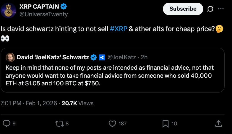 This post is being widely misinterpreted. David Schwartz is not hinting at holding XRP for higher prices, nor is he subtly advising people not to sell. He’s doing two very specific things: first, reiterating (again) that he does not give financial advice; second, using self-deprecating humour to explain why, pointing out that he previously sold large amounts of ETH and BTC far too early, which is precisely why he doesn’t position himself as someone whose personal actions should be copied. Separately, Schwartz has already explained why extreme price targets like $100 XRP are not realistic under current market structure. There is no hidden message here, no coded signal to “hold,” and no bullish wink just a reminder not to outsource your investment decisions to anyone else, including him.
