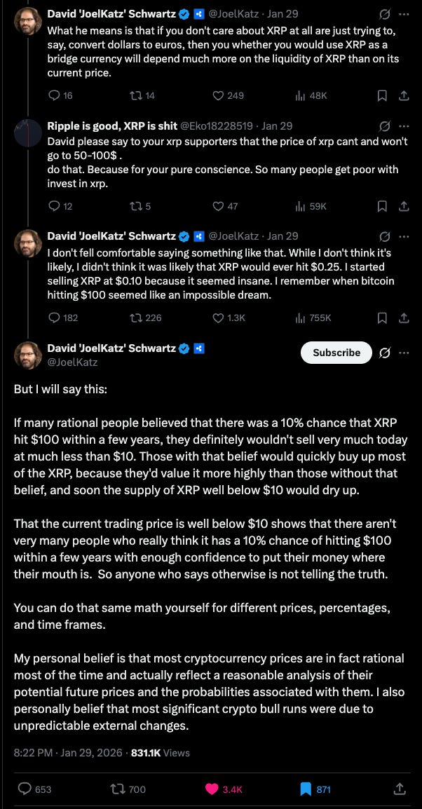 In a recent viral exchange, Ripple CTO David Schwartz applied a “logic test” to the persistent theory that XRP could hit $100. Schwartz argued that if the market truly assigned even a 10% probability to XRP reaching $100 in the near future, the current price would naturally gravitate toward $10 as rational investors bought up supply. The fact that XRP trades significantly lower suggests that very few market participants actually believe in a triple-digit outcome with enough confidence to “put their money where their mouth is.” He noted that those claiming such a move is a mathematical certainty are likely not being truthful about their own level of conviction.