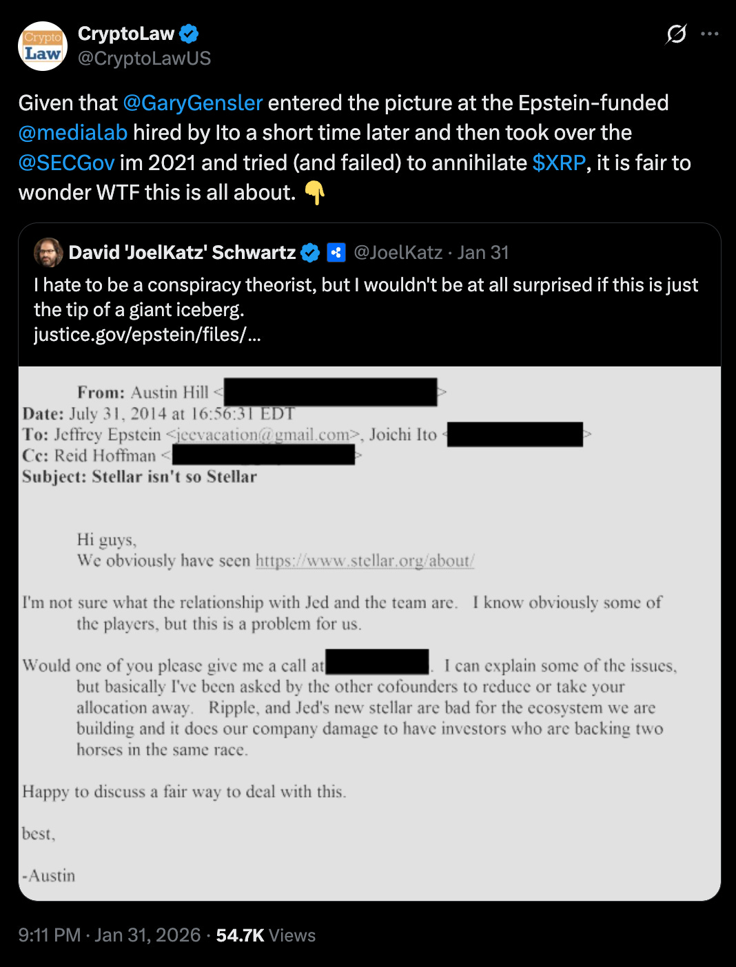 Sensei’s Insight: This one stopped me in my tracks. @CryptoLawUS connects a dot that deserves attention: Gary Gensler entered the picture at Ito's Epstein-funded MIT Media Lab, then went on to lead the SEC and wage one of the most aggressive enforcement campaigns against XRP in crypto history. Coincidence? Maybe. But when you lay the timeline out Epstein's money flowing into MIT, Ito hiring Gensler, Blockstream's CEO lobbying Epstein to kill Ripple, and then the SEC doing exactly that years later the questions write themselves. I'm putting out the full breakdown in today's newsletter. Everything I've found. Stay tuned.