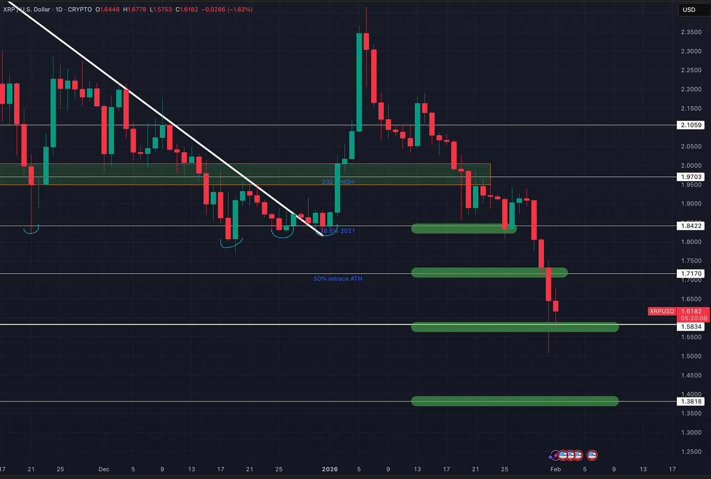 That said, if we fail to stabilise and instead see a capitulation move to the downside, I won’t be chasing. My next buy level for XRP in that scenario sits at $1.38, and I’ll be waiting patiently for price to come to me.