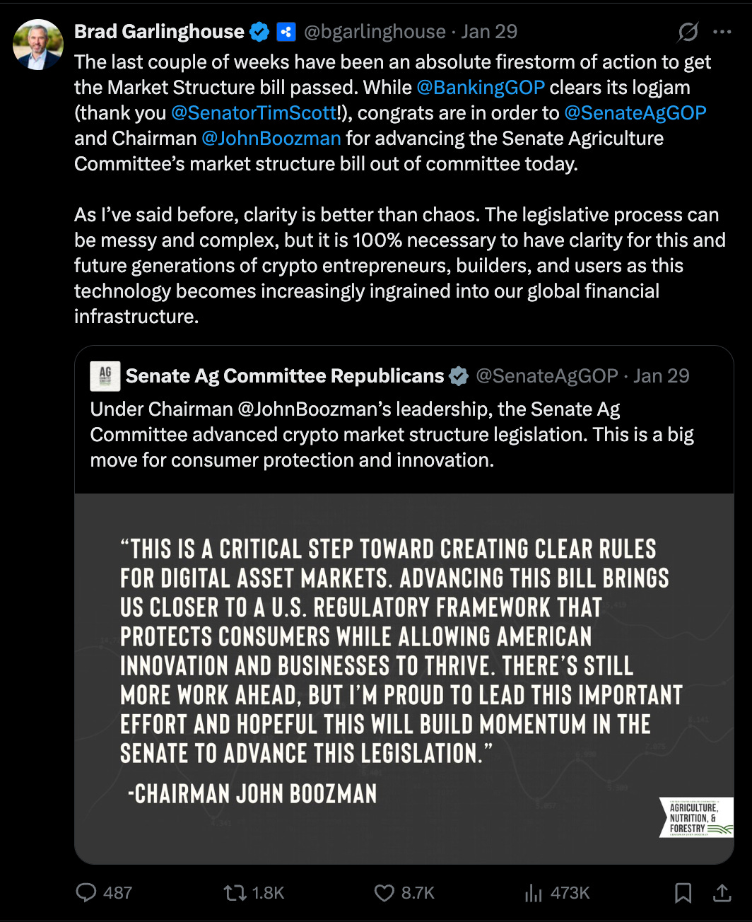 Sensei’s Insight: On January 29, the Senate Agriculture Committee voted to advance the Digital Commodity Intermediaries Act, marking the first time a crypto market structure bill has ever cleared a Senate committee. The bill passed on a party-line vote, 12 Republicans to 11 Democrats, and would give the CFTC new regulatory authority over digital commodities. As Brad Garlinghouse noted, this has been an absolute firestorm of legislative action, and he’s right. The House already passed the CLARITY Act last July with 78 Democratic votes, and now the Senate side is finally moving. The significance for XRP holders is straightforward: the CLARITY Act framework classifies digital assets as either digital commodities, investment contract assets, or permitted payment stablecoins, and assets classified as digital commodities fall under the CFTC rather than the SEC. That is exactly the regulatory clarity Ripple has been fighting for since 2020. The Senate Banking Committee still needs to pass its own version before the two can be combined and sent to the full Senate floor, and that side has been messier with disagreements over stablecoin yield and industry pushback from Coinbase. But the direction of travel is clear. Legislation is advancing, not stalling, and every step forward reduces the regulatory risk that has hung over XRP for years. This is bullish not because it changes anything tomorrow, but because it narrows the path toward the one outcome that matters most for long-term XRP holders: federal law that settles the commodity versus security question once and for all.