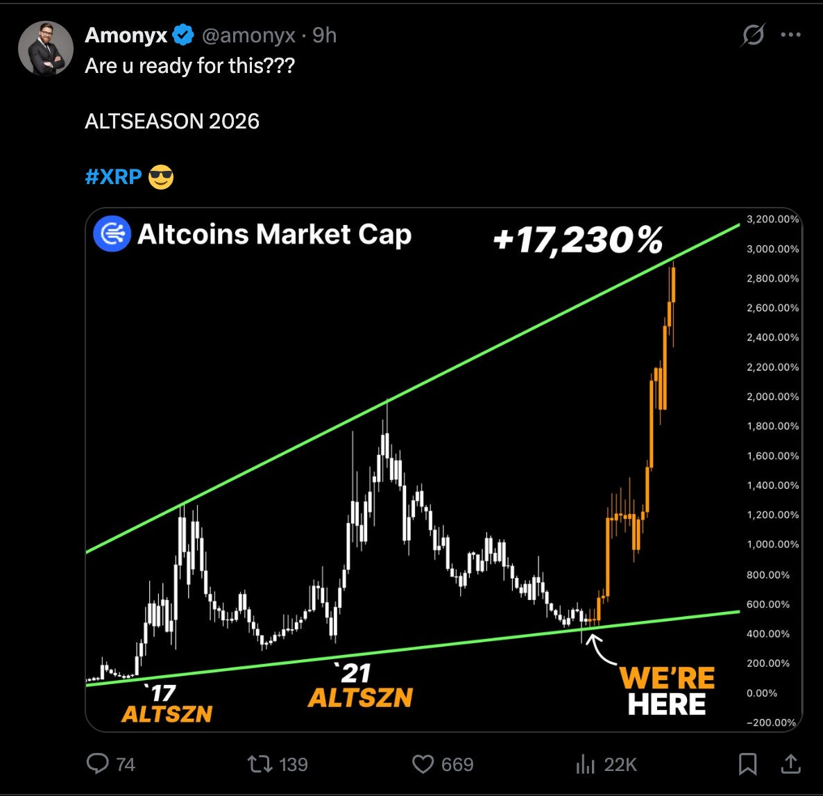 Posts like this are designed to trigger engagement by drawing a single straight line through past cycles and implying a repeat is inevitable. The problem is that altcoin market cap does not move in clean channels, and the outsized gains seen in 2017 or 2021 came from a much smaller market base under radically different liquidity, rate, and regulatory conditions. Projecting a +17,000 percent move into 2026 ignores dilution, project failure, capital rotation, and the reality that each cycle delivers diminishing percentage returns. Yes, 2026 can still be a strong year for quality assets like XRP, but setting expectations at extreme upside targets is how investors end up frustrated even after solid gains. Long term success comes from realistic positioning, managing risk, and recognizing that discipline outperforms hopium over full market cycles.