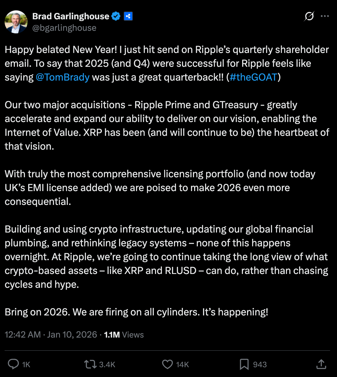 Sensei’s Insight: The most important line in this post is not about acquisitions or licenses, it is Brad Garlinghouse explicitly stating that XRP has been and will continue to be the heartbeat of Ripple’s vision. That matters because it directly contradicts the recurring narrative that XRP is somehow incidental to the company’s strategy. Garlinghouse has been consistent on this point for years, and he reiterates it precisely when Ripple is strongest, not when it needs hype. XRP is framed here as core infrastructure, not a marketing tool or speculative byproduct. When leadership repeatedly anchors the long term vision around XRP alongside regulated products like RLUSD, it signals alignment between corporate strategy and the asset itself. For investors, that clarity is far more valuable than short term price commentary.