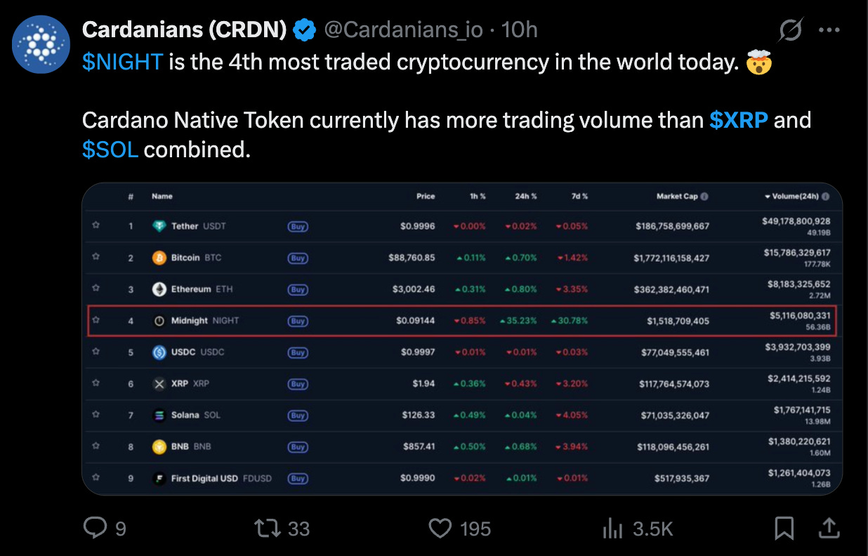 The claim that Midnight (NIGHT) is the world’s 4th most traded cryptocurrency with a volume exceeding $XRP and $SOL combined is false and based on a fabricated screenshot.This viral "proof" is a classic social engineering tactic designed to manufacture FOMO (Fear Of Missing Out) and lure investors into potential "pump and dump" schemes or phishing sites by using distorted metrics that mimic legitimate platforms. To stay safe on X, treat any screenshot claiming "record-breaking" stats as a red flag until you verify it yourself on a neutral aggregator like CoinMarketCap or CoinGecko; scammers often use high-quality digital fakes and bot-driven "likes" to create a false sense of consensus around a project before pulling liquidity.