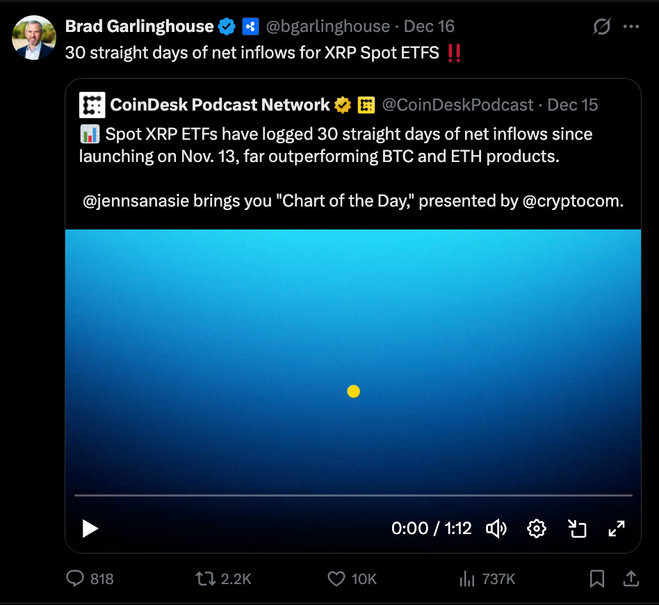 📈 XRP ETFs hit record inflows: Spot funds saw 32 straight days of buying, totaling $1.14 billion since November.