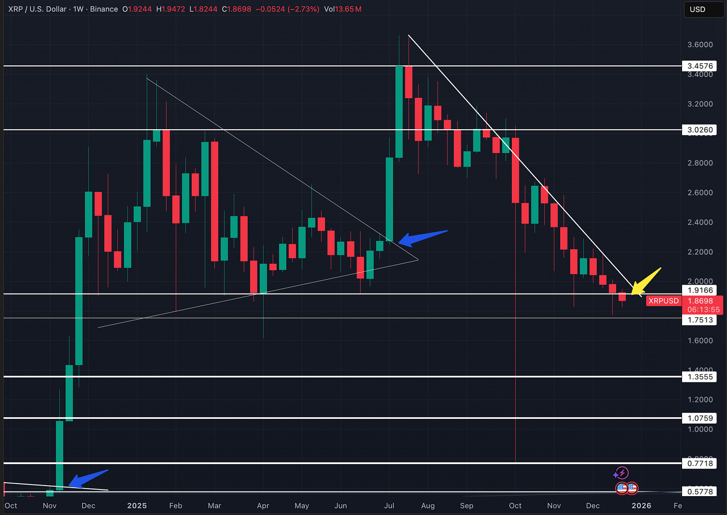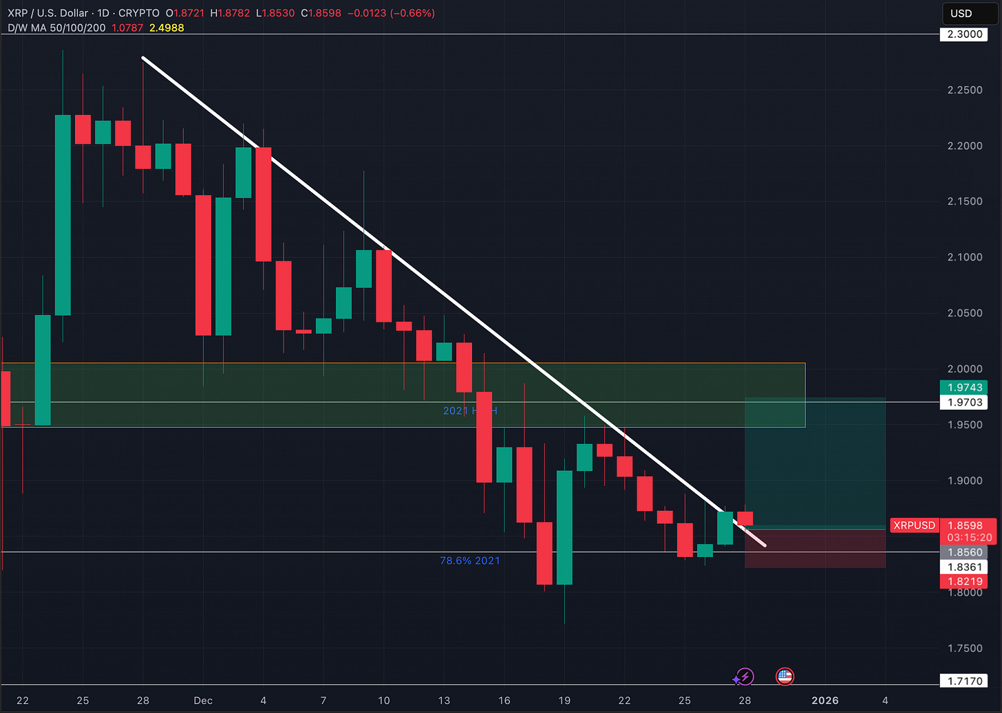 When sentiment turns extremely bearish, we often see short squeezes and violent counter-trend moves. That’s why the descending trendline remains critical. If price bases around $1.80–$1.70, breaks the downtrend, and reclaims structure, that opens a credible path toward a stronger recovery, and potentially a run toward prior highs into 2026.