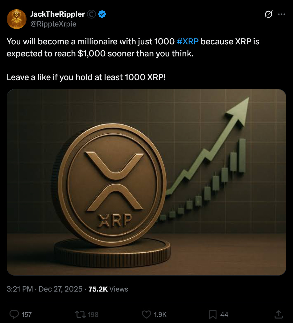This is a classic social engineering tactic used by influencers to manufacture FOMO. They don’t make money when you get rich; they make money from your clicks, ad revenue, and selling you leverage trading or “exclusive” courses. While XRP has seen solid growth from institutional ETF adoption this year, targets like $1,000 are digital fairy tales designed to keep you “bag-holding” while influencers profit from your attention. Always verify hype against basic market math: if it sounds too good to be true, you are the product.
