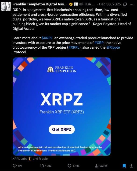 Sensei’s Insight: When Franklin Templeton publicly frames XRP as a foundational building block, that is institutional language, not marketing fluff. This is how legacy finance categorises assets it expects to persist across cycles, not trade around headlines. Price action may still look unimpressive, but structurally this matters far more: XRP is being positioned as infrastructure, and infrastructure adoption is measured in years, not candles.