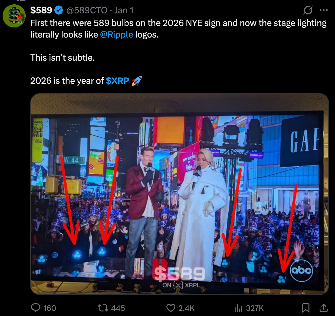 This is apophenia amplified by social media. When investors desperately want confirmation, random coincidences start looking intentional. The same blue lights were used in prior years, across multiple events, and across unrelated broadcasts. There is no institutional pathway where Ripple, ABC, or NYC officials would coordinate secret market signals via LED placement.