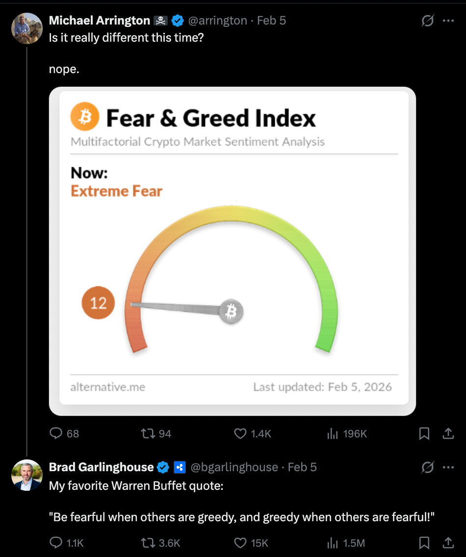 Sensei’s Insight: Garlinghouse replied to Michael Arrington's Fear & Greed Index post at 12 with the classic Buffett line: "Be fearful when others are greedy, and greedy when others are fearful." 1.5 million views. This is the CEO of Ripple, during a market-wide crash that wiped over $410 billion from crypto in a month, publicly saying he sees opportunity not panic. These crashes happen a few times a year in crypto. They feel like the end of the world every single time, and every single time the people who bought extreme fear ended up better off than the people who sold it. That is all he is saying. Take from that what you will, but the signal is clear.