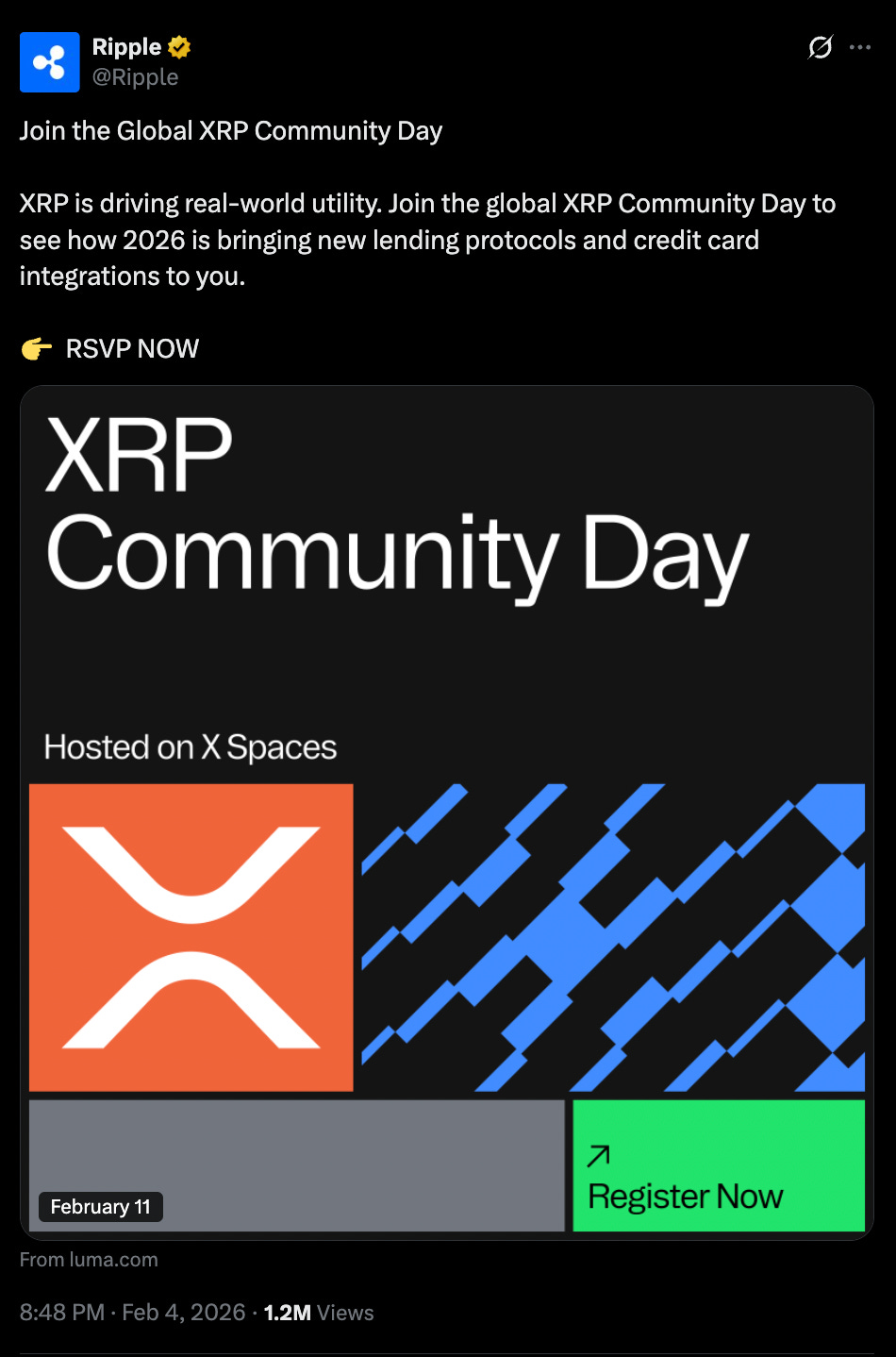 Sensei’s Insight: Ripple's official post about XRP Community Day has already hit 1.2 million views and the event hasn't even started yet. February 11–12, free on X Spaces, with Garlinghouse, Monica Long, Schwartz, Grayscale, Gemini, and Solana Foundation all on the lineup. They're teasing new lending protocols and credit card integrations on top of everything else. I'll be covering the entire event live on YouTube on Martyn Lucas Investor, breaking it all down in real time. If you want to know what actually gets announced versus what's just talk, that's where you want to be. Subscribe and turn on notifications so you don't miss it.