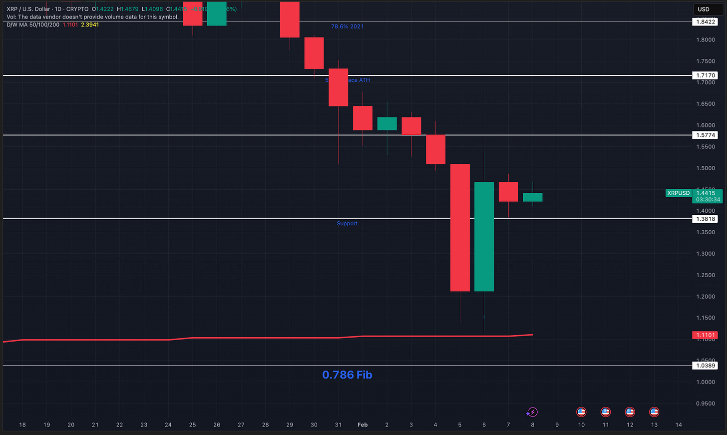 XRP wicked down to $1.11 on February 5, tagging the 200-week moving average almost to the cent before producing an aggressive bounce back to $1.54. On the chart you can see resistance sitting at $1.58 and $1.71, with support around $1.38. The bounce has been sharp and can continue, but I would not be surprised to see price pull back and sweep the lows as a double bottom before any sustained move higher. As I mentioned to the Substack community, I sold the position I opened at $1.13 at $1.40.