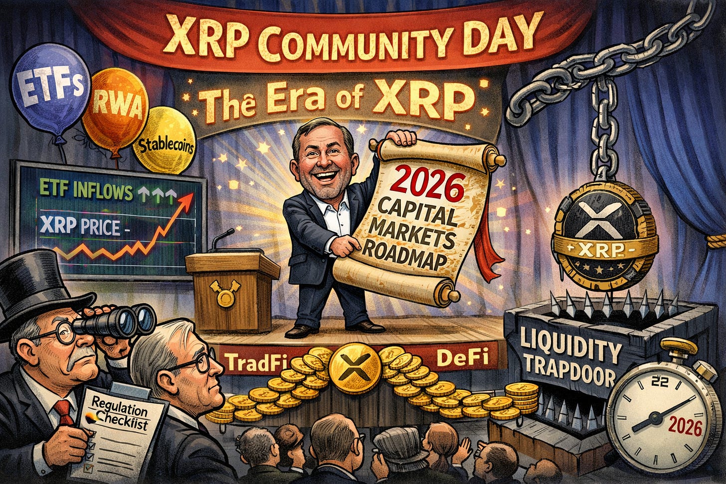 Ripple is hosting XRP Community Day this week on February 11–12 across three free live X Spaces covering EMEA, Americas, and APAC. This year’s theme is “The Era of XRP in Capital Markets.” Garlinghouse opens by positioning XRP as infrastructure for regulated finance. Long closes with a session called “XRP at the Core of Ripple’s Business.” That title alone is a statement. XRP has faced no shortage of criticism over whether the token actually matters to what Ripple does as a company, and this event is Ripple putting XRP front and center of its strategy in the most public way possible.