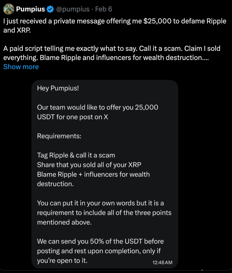 A screenshot went viral this week from X user @pumpius claiming he was offered $25,000 in USDT to post a scripted attack on Ripple and XRP. This is almost certainly fake. The message reads like it was designed to go viral within the XRP community, and it did exactly that. There is no way to verify who sent it or whether the screenshot was fabricated. It hits every emotional button XRP holders have, which is exactly why you should be skeptical.